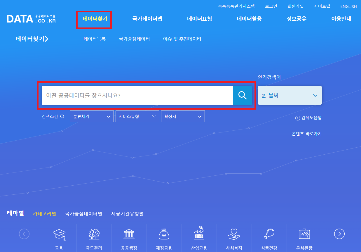원하는 데이터를 검색하기 위해 [데이터 찾기] 또는 메인 페이지에 있는 검색창을 이용할 수 있다.