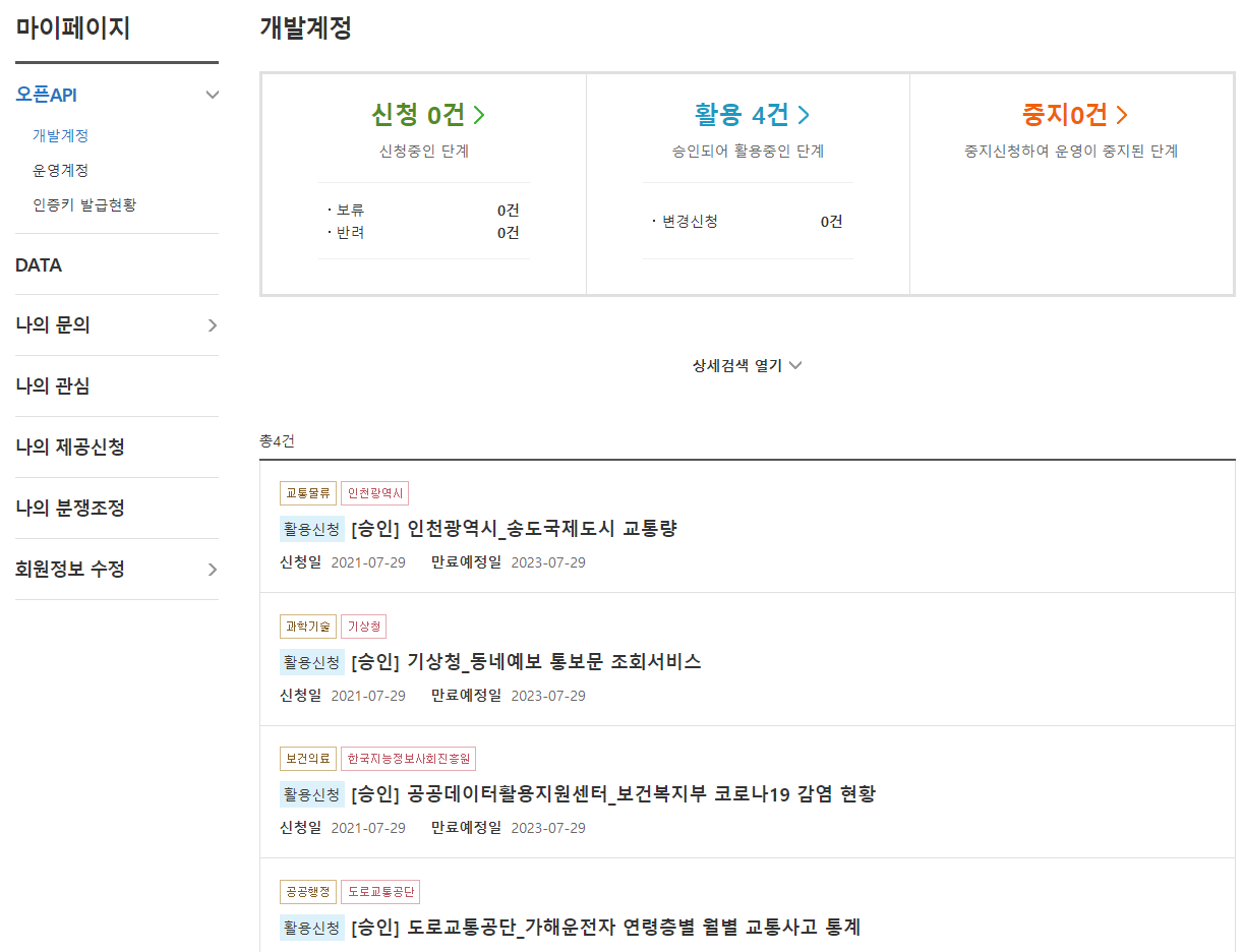 마이페이지로 들어가면 활용신청 목록을 조회할 수 있다.