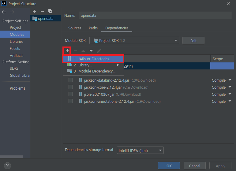 <2> File -> Project Structure -> Project Settings -> Dependencies -> Modules 에서 다운받은 .jar 추가
