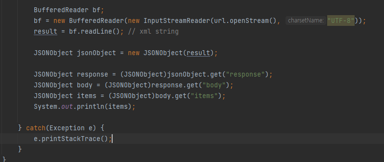 XML 형식의 응답 메세지를 String 객체에 저장해서 toJSONObject() 메소드에 넣어주기만 하면, JSON 데이터를 바로 이용할 수 있는 상태가 되는 것이다.