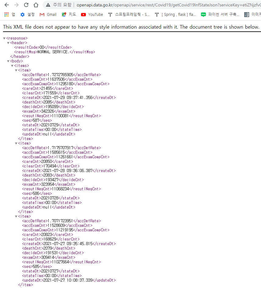 {"response":{"header":{"resultCode":"00","resultMsg":"NORMAL SERVICE."},"body":{"pageNo":1,"totalCount":8,"items":{"item":[{"accDefRate":1.7272765905,"clearCnt":171559,"stateDt":20210729,"updateDt":null,"createDt":"2021-07-29 09:37:41.356","examCnt":342326,"accExamCnt":11637506,"stateTime":"00:00","deathCnt":2085,"decideCnt":195099,"resutlNegCnt":11100081,"accExamCompCnt":11295180,"careCnt":21455,"seq":587},{"accDefRate":1.7175707917,"clearCnt":170494,"stateDt":20210728,"updateDt":null,"createDt":"2021-07-28 09:36:06.387","examCnt":323954,"accExamCnt":11585615,"stateTime":"00:00","deathCnt":2083,"decideCnt":193427,"resutlNegCnt":11068234,"accExamCompCnt":11261661,"careCnt":20850,"seq":586},{"accDefRate":1.7071723951,"clearCnt":168629,"stateDt":20210727,"updateDt":"2021-07-27 10:08:37.339","createDt":"2021-07-27 09:35:45.815","examCnt":309414,"accExamCnt":11528609,"stateTime":"00:00","deathCnt":2079,"decideCnt":191531,"resutlNegCnt":11027664,"accExamCompCnt":11219195,"careCnt":20823,"seq":585},{"accDefRate":1.6992241235,"clearCnt":167365,"stateDt":20210726,"updateDt":null,"createDt":"2021-07-26 09:40:26.165","examCnt":281003,"accExamCnt":11472346,"stateTime":"00:00","deathCnt":2077,"decideCnt":190166,"resutlNegCnt":11001177,"accExamCompCnt":11191343,"careCnt":20724,"seq":584},{"accDefRate":1.6924008113,"clearCnt":166375,"stateDt":20210725,"updateDt":null,"createDt":"2021-07-25 09:32:34.468","examCnt":274761,"accExamCnt":11433347,"stateTime":"00:00","deathCnt":2073,"decideCnt":188848,"resutlNegCnt":10969738,"accExamCompCnt":11158586,"careCnt":20400,"seq":583},{"accDefRate":1.6794988233,"clearCnt":165246,"stateDt":20210724,"updateDt":null,"createDt":"2021-07-24 09:38:51.376","examCnt":274697,"accExamCnt":11430525,"stateTime":"00:00","deathCnt":2068,"decideCnt":187362,"resutlNegCnt":10968466,"accExamCompCnt":11155828,"careCnt":20048,"seq":582},{"accDefRate":1.6717199382,"clearCnt":164206,"stateDt":20210723,"updateDt":null,"createDt":"2021-07-23 09:37:34.575","examCnt":278011,"accExamCnt":11388305,"stateTime":"00:00","deathCnt":2066,"decideCnt":185733,"resutlNegCnt":10924561,"accExamCompCnt":11110294,"careCnt":19461,"seq":581},{"accDefRate":1.6624163319,"clearCnt":163073,"stateDt":20210722,"updateDt":null,"createDt":"2021-07-22 09:39:47.617","examCnt":269496,"accExamCnt":11343918,"stateTime":"00:00","deathCnt":2063,"decideCnt":184103,"resutlNegCnt":10890319,"accExamCompCnt":11074422,"careCnt":18967,"seq":580}]},"numOfRows":10}}}