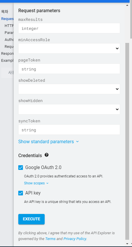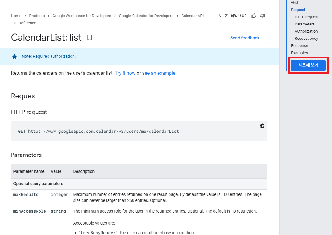 구글 캘린더의 리스트를 확인하려면 API 문서의 CalendarList: list 항목을 참고하면 된다.