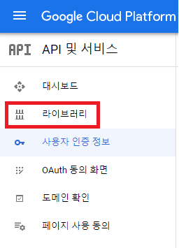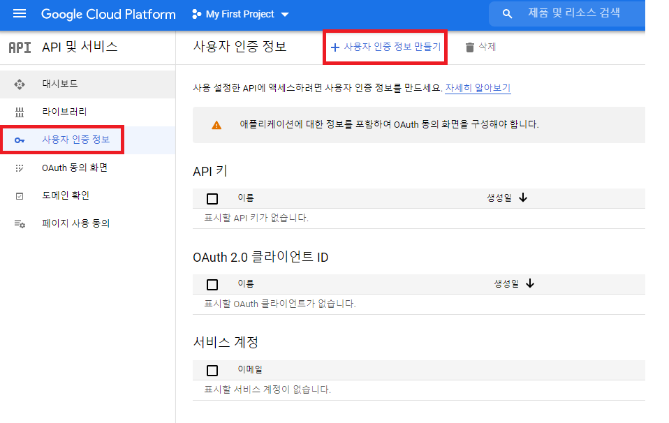 좌측 메뉴의 [API 및 서비스]에 들어가면 API를 사용하기 위한 인증 정보들을 확인할 수 있는데, 사용자 인증 정보를 만들어야 인증 정보들이 표시된다.