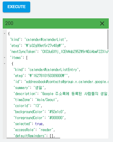 CalendarList: list의 요청 파라미터들은 모두 Optional이기 때문에 바로 [EXECUTE]를 눌렀다.