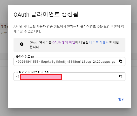 Client 비밀번호를 잊어버렸어도 [OAuth 클라이언트 수정]에서 확인 가능하다.