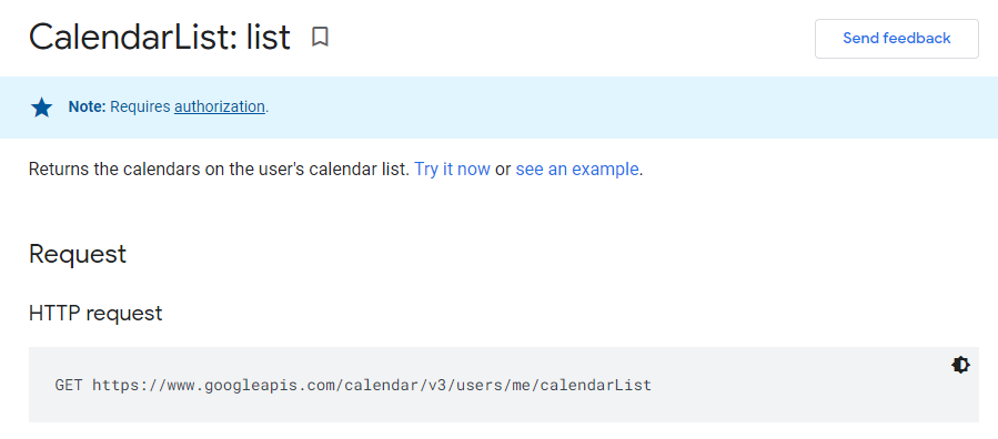 Note: Requires authorization. Returns the calendars on the user's calendar list. Try it now or see an example. Request HTTP request GET https://www.googleapis.com/calendar/v3/users/me/calendarList Parameters Parameter name Value Description Optional query