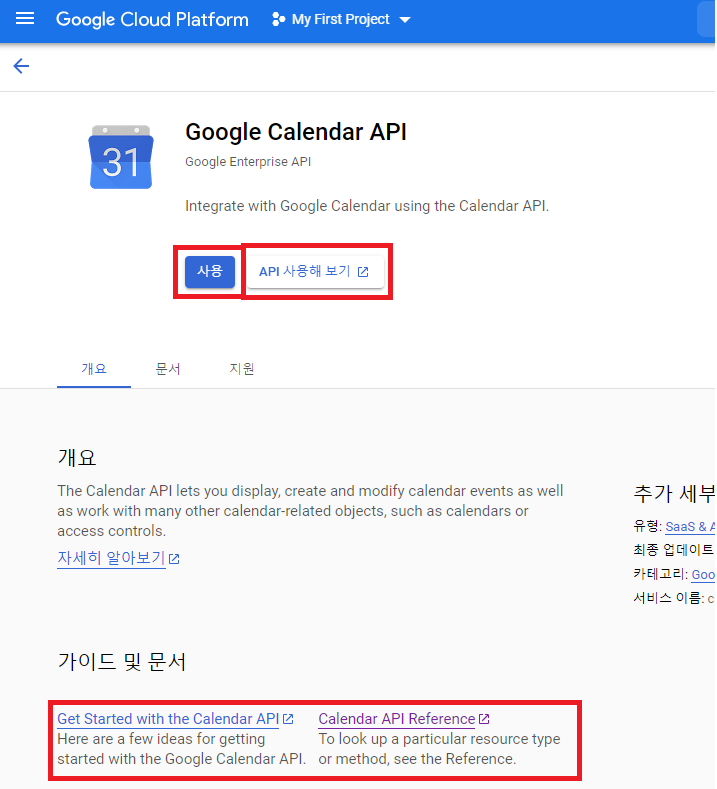이번 예제에서는 Google Calendar API를 사용할 것이기 때문에 사용 설정을 해야 한다.