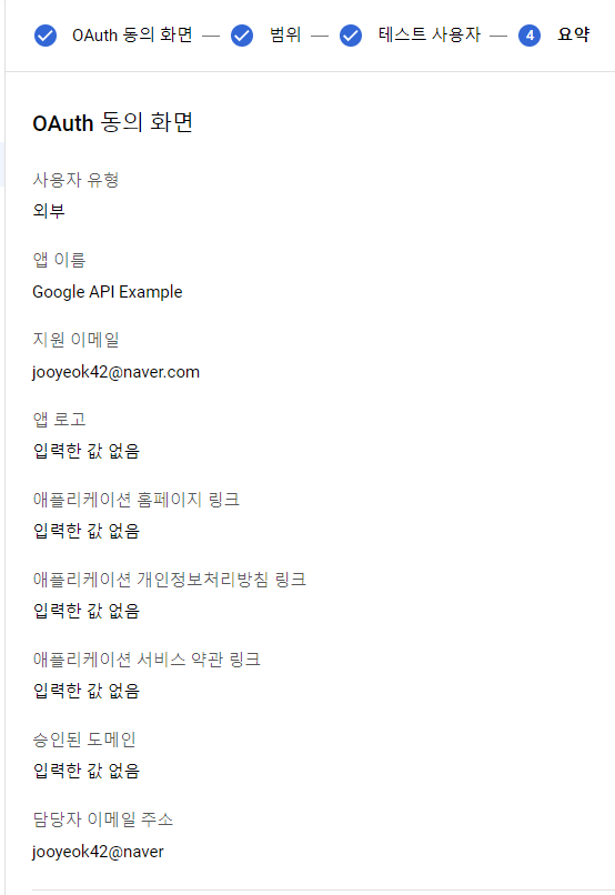 사용자 유형, 앱 이름, 지원 이메일 외에는 모두 생략했다.