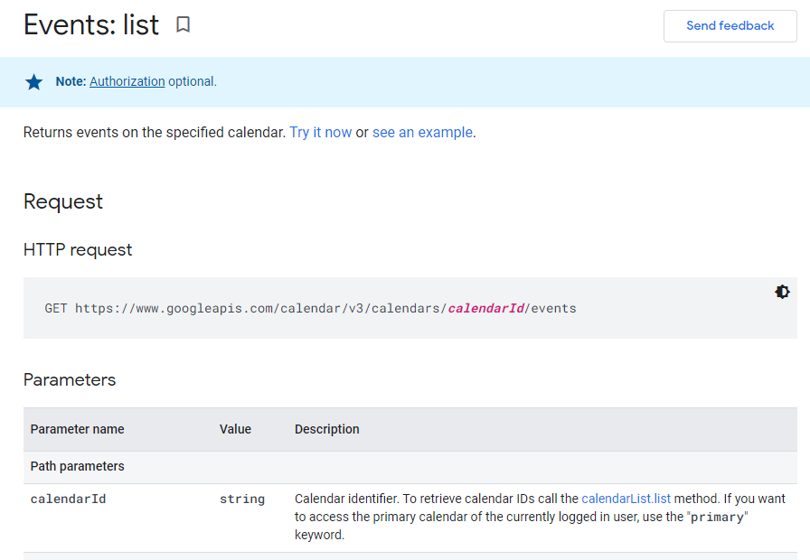 필수 파라미터는 calendarId이며, calendarList에서 조회한 캘린더의 ID를 사용하면 된다고 명시되어있다.