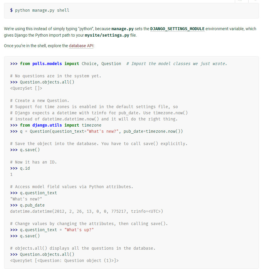 https://docs.djangoproject.com/en/3.2/intro/tutorial02/#playing-with-the-api