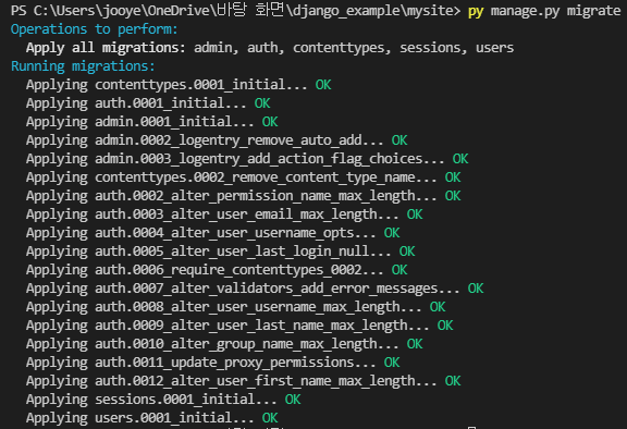 설명 : makemigrations 명령에 의해 생긴 마이그레이션 파일들을 이용하여 모델에서의 변경사항들과 데이터베이스 스키마 간의 동기화를 수행해 주는 명령어