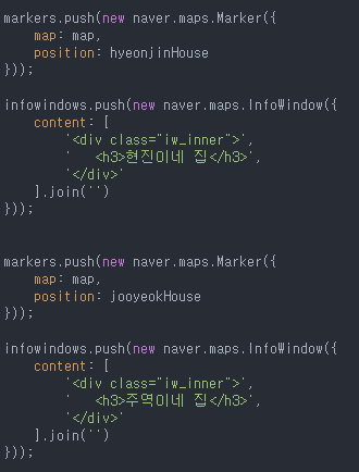 저번 예제에서는 마커를 2개만 썼기 때문에 큰 문제는 없었다. 그러나 나중에 마커의 수가 매우 많아지면, 코드의 수도 매우 길어지고 그만큼 유지 보수도 매우 힘들어질 것이다.