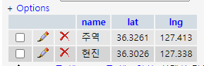 Mysql에 home테이블을 생성하고, (이름, 위도, 경도) 데이터 쌍을 가지는 레코드를 2개 추가했다.