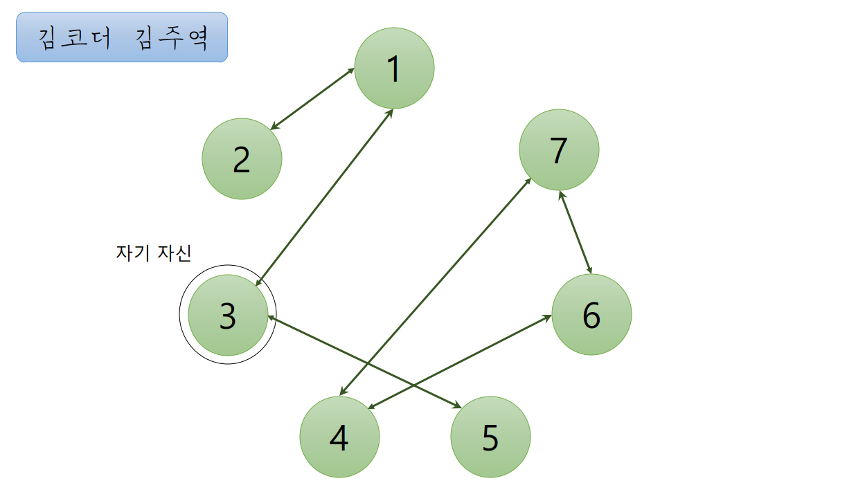 일단 아래 그림은 9466번 예제에서 첫 번째 케이스를 도식화 한것이다. 3번은 자기 자신을 가리킨다는 의미로 동그라미로 감쌌다.