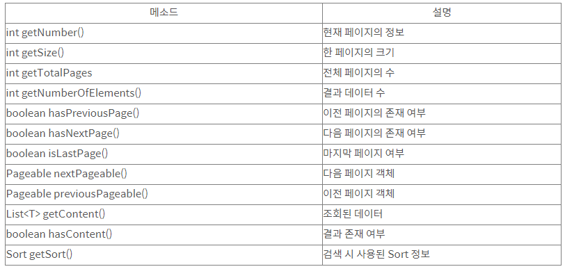 - Pageable에는 페이지 위치, 한 페이지 당 포함할 결과 수를 지정할 수 있고, 페이징 안에서 Sort 객체를 사용하여 정렬할 수도 있다.