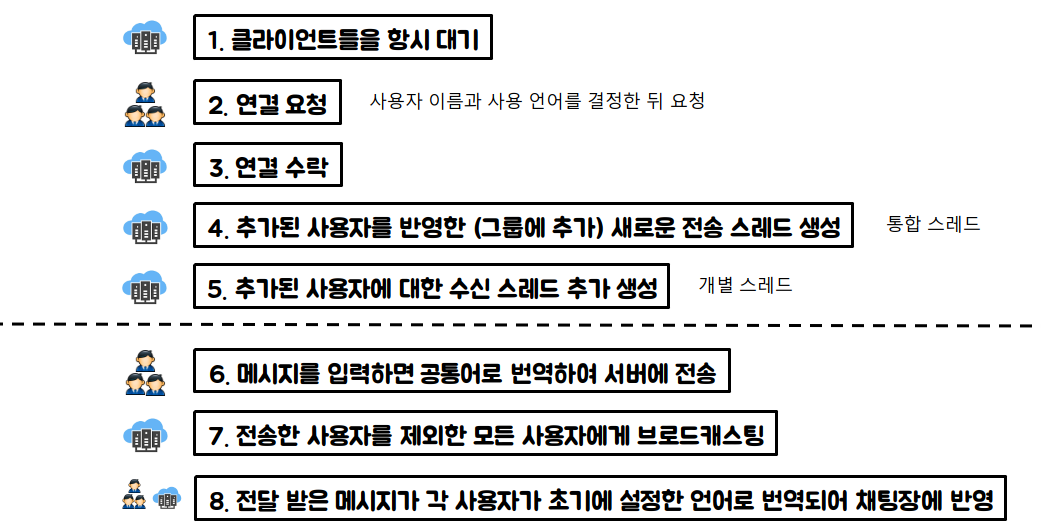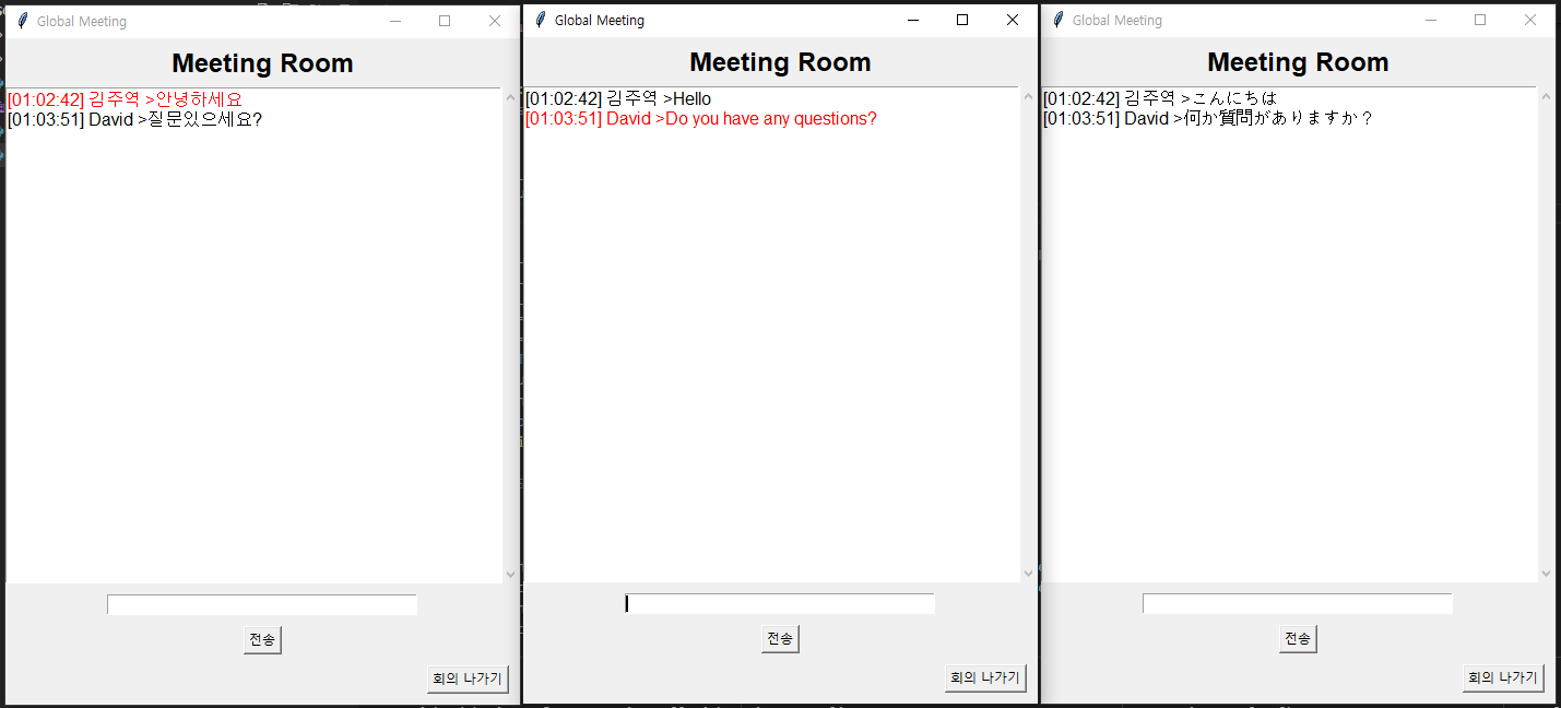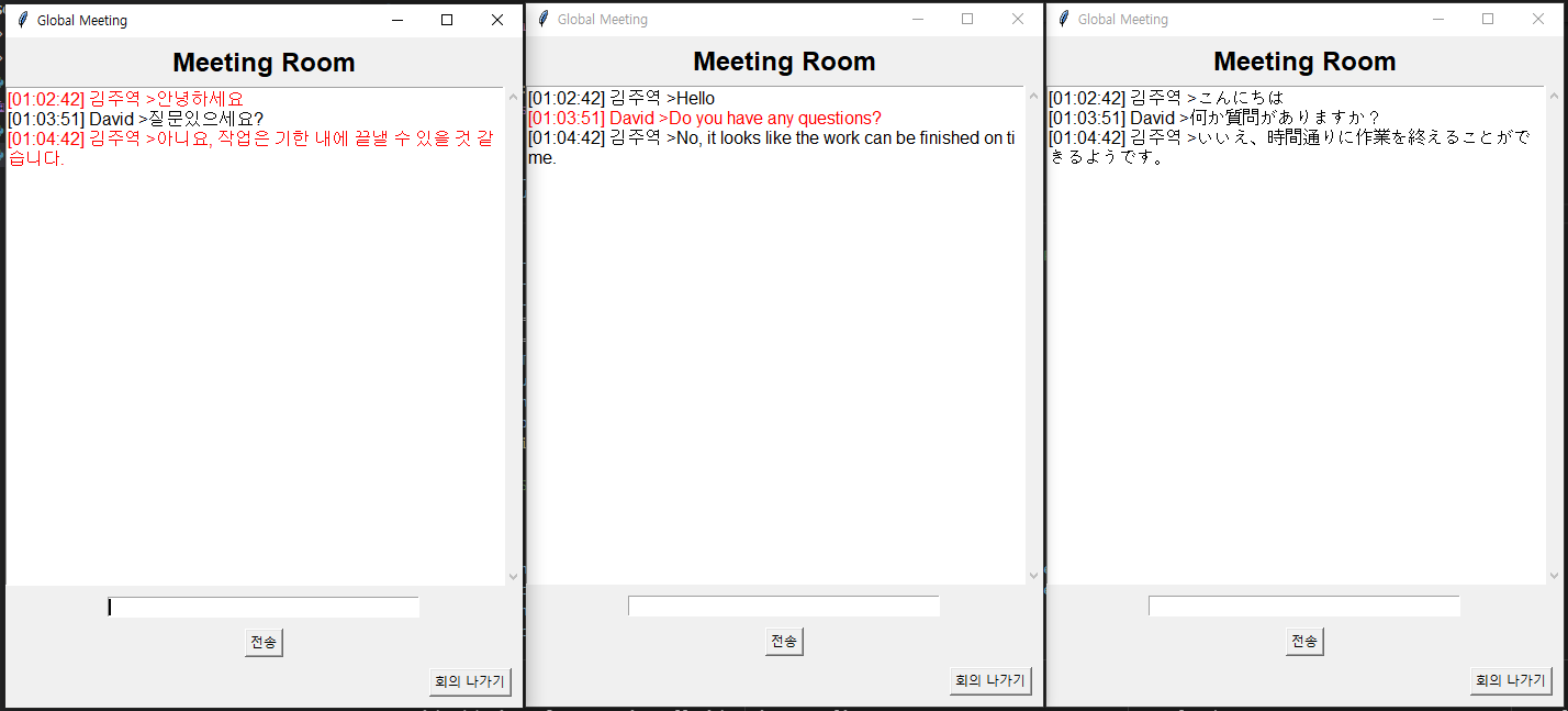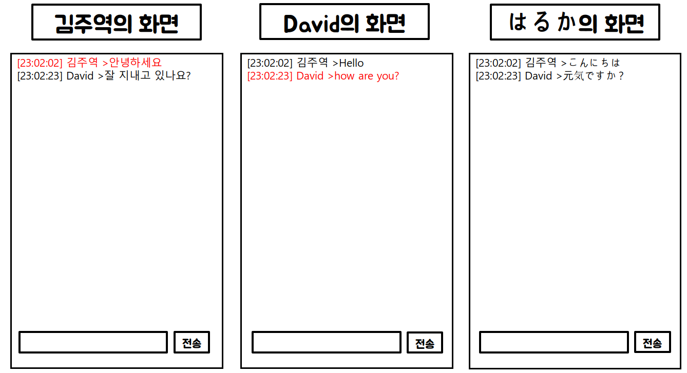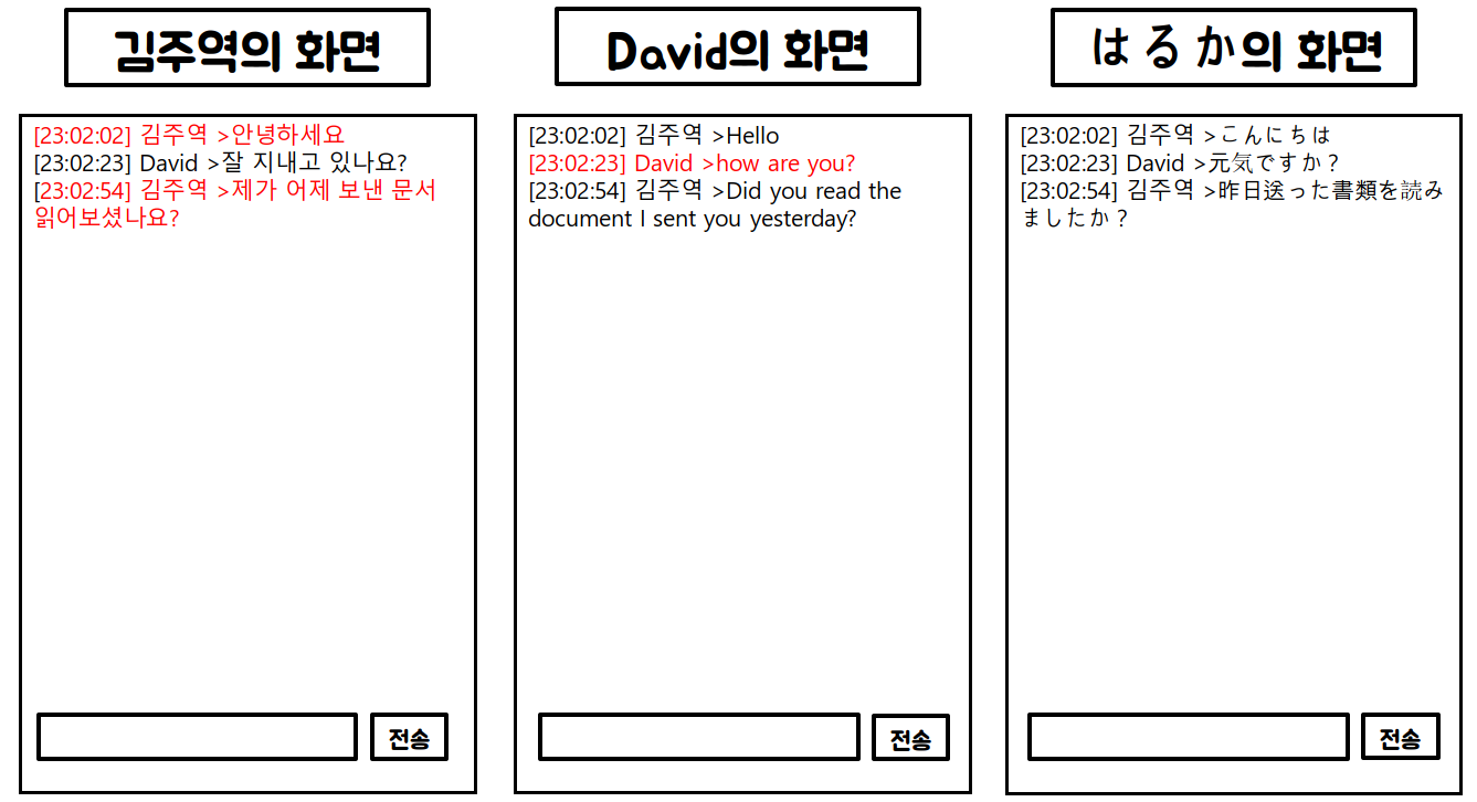 - 누군가가 메시지를 전송하면, 메시지가 각 사용자의 선택 언어로 자동 번역되어 표시된다.