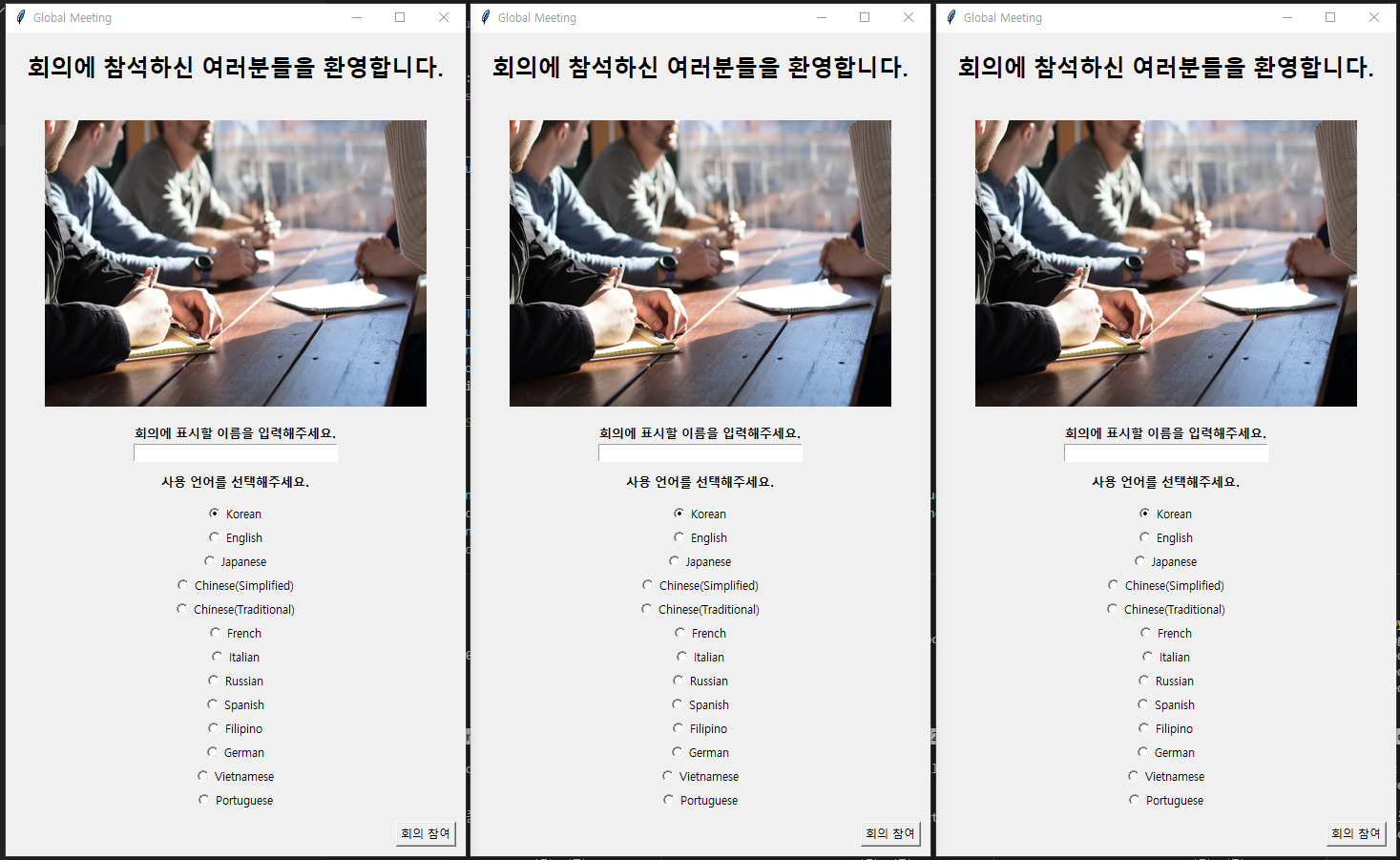 - 회의에 표시할 이름과 사용 언어를 선택한다.