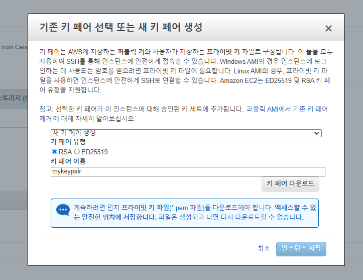 - 마지막으로, 단계 7에서 우측 하단에 있는 [시작]을 누르면 Key pair을 생성하거나 선택하라는 창이 나올 것이다.