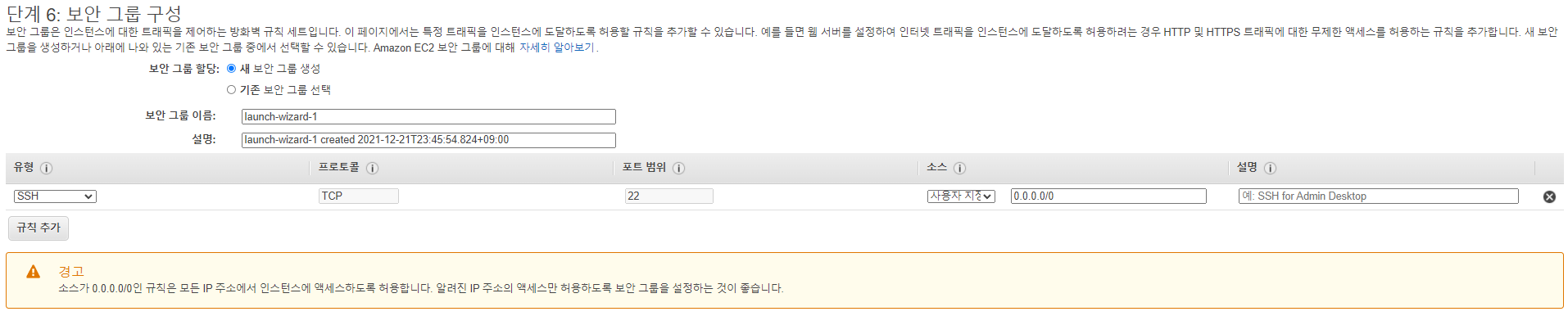 - 아래쪽을 보면 인바운드 규칙이라는 메뉴가 보이는데, 인바운트 규칙 편집을 클릭하여 아래와 같이 0.0.0.0/0(모든 IP)에 대한 접근을 허용하도록 규칙을 추가한다. 물론, 이 방식이 위험하다고 느껴진다면 여러분의 공인 IP만 허용하도록 해도 좋다.