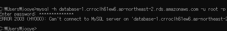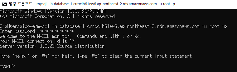 mysql -h [엔드포인트] -u [마스터 ID] -p
