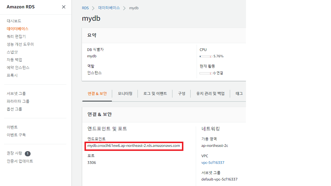 - 빨간 상자로 표시한 엔드포인트가 DB의 주소이다.