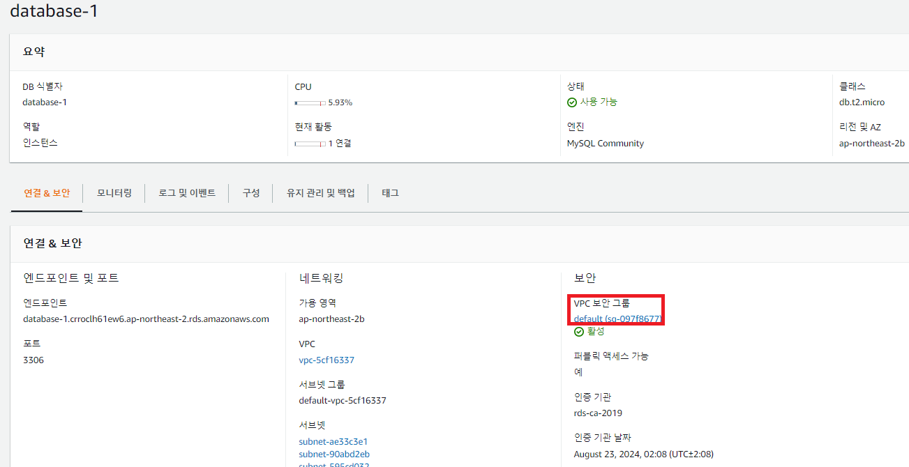 - 네트워크의 VPC ID가 RDS의 VPC ID와 일치한지 반드시 확인하고 넘어간다.