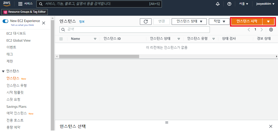 - EC2 콘솔의 인스턴스 메뉴에서 [인스턴스 시작]을 누른다.