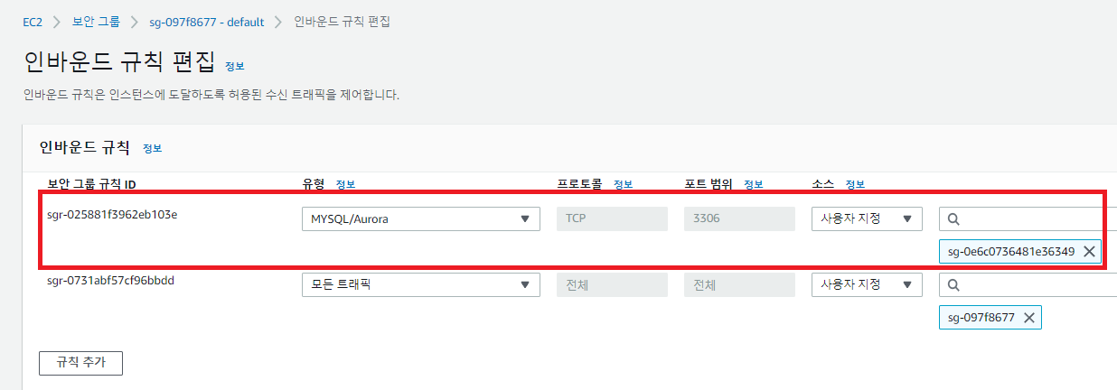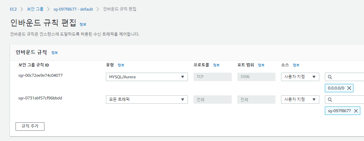 - 마지막으로, RDS 보안 그룹의 인바운드 규칙에 EC2 보안 그룹의 ID를 추가해주면 된다.