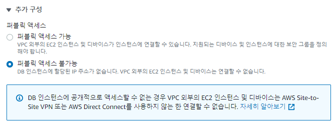 - 먼저, DB 인스턴스의 [수정]에 들어가서 public access를 불가능으로 체크한다.
