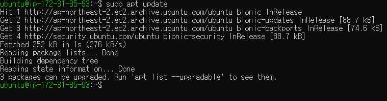 - 원격 접속을 하고나서, "sudo apt update" 명령어를 통해 우분투의 고급 패키징 도구인 apt를 최신 상태로 업데이트 해두는 것이 좋다.