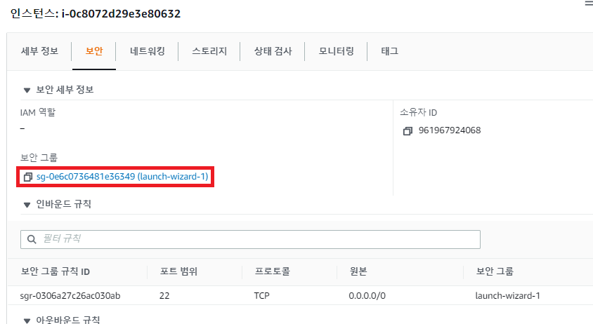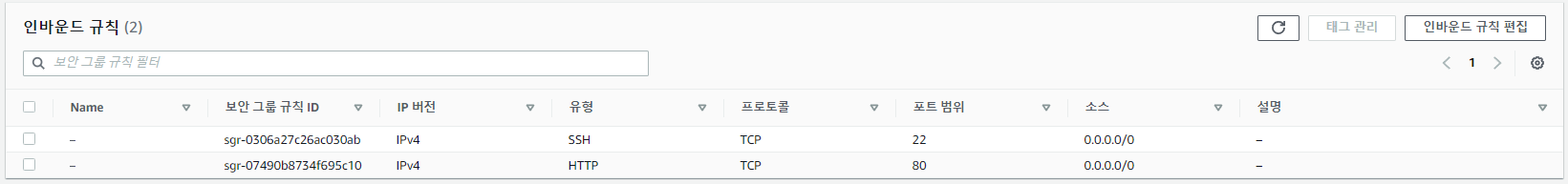 - Apache 서버를 통해 EC2 컴퓨터에 접속하려면, 이 EC2 인스턴스의 보안 그룹에 들어가서 Apache의 기본 포트인 80번 포트를 개방하도록 인바운드 규칙을 추가해야 한다. 설정 전에는 22번 포트만 개방된 상태일 것이다.