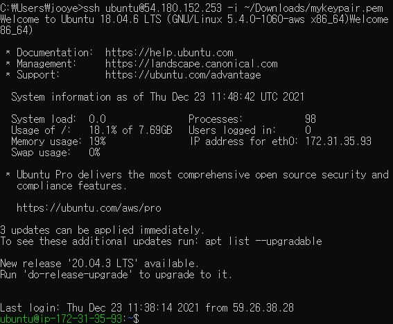 ssh ubuntu@[Public IP DNS or Address] -i [key pair 저장 위치]