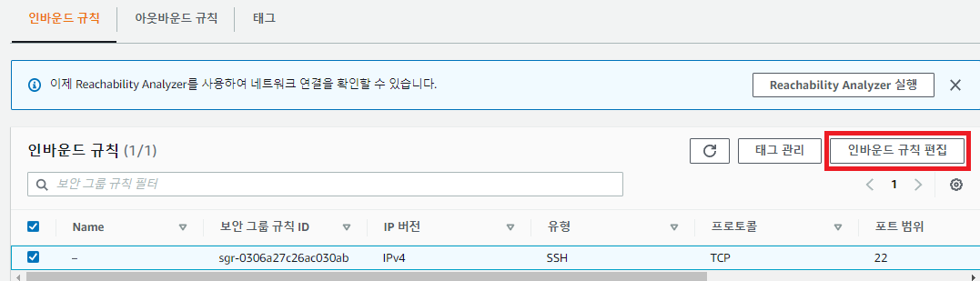 - 인바운드 규칙 메뉴에서 [인바운드 규칙 편집]을 누른다.