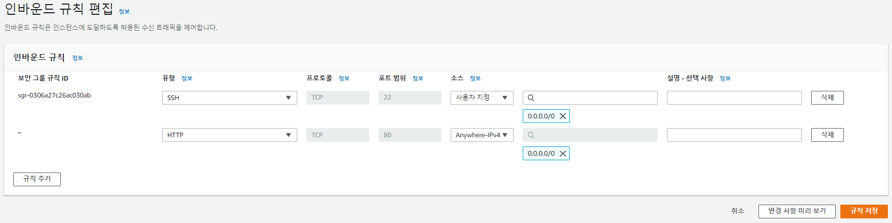 - Apache 서버를 통해 EC2 컴퓨터에 접속하려면, 이 EC2 인스턴스의 보안 그룹에 들어가서 Apache의 기본 포트인 80번 포트를 개방하도록 인바운드 규칙을 추가해야 한다. 설정 전에는 22번 포트만 개방된 상태일 것이다.