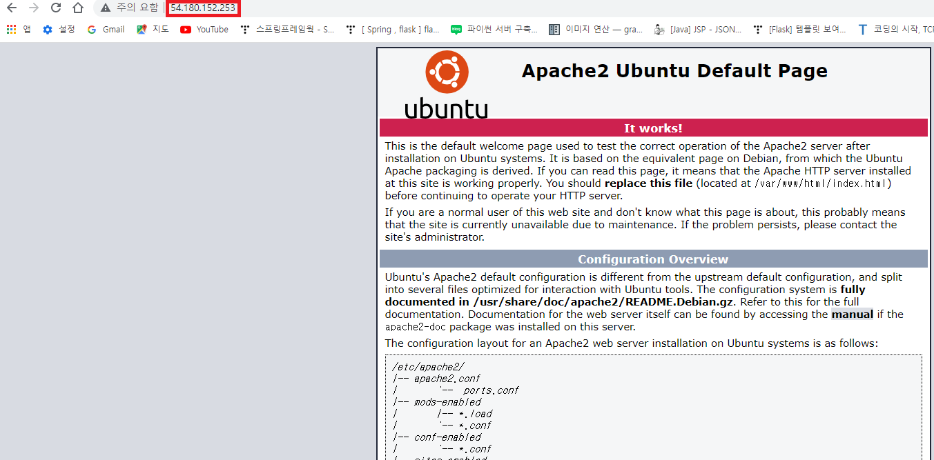 - 모든 접속 준비는 끝났다. 이제 URL 창에 EC2 인스턴스의 공인 DNS 혹은 공인 IP 주소를 입력하면 된다.