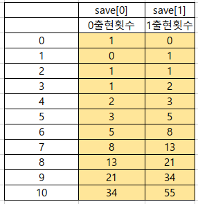fibonacci(n)에서 0의 출현횟수는 fibonacci(n-1)의 0 출현횟수 + fibonacci(n-2)의 0 출현횟수