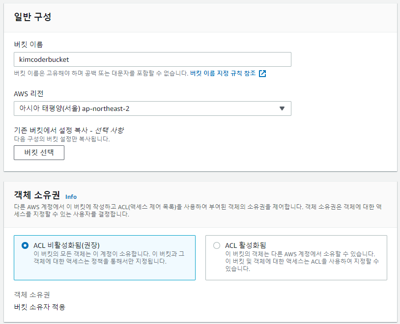 - 객체 소유권은 해당 버킷을 소유할 AWS 계정의 범위를 결정하는 설정이다. 버킷을 자신의 계정에서만 소유할 수도 있고, 다른 AWS 계정에서도 소유하도록 할 수도 있다.