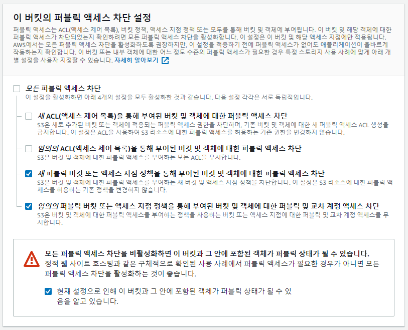 - 퍼블릭 액세스를 차단한다는 것은 외부에서도 파일을 읽게 하지 못한다는 의미다. 퍼블릭 액세스를 경우에 따라 차단하고 싶다면, "모든 퍼블릭 액세스 차단"은 비활성화하고 세부적인 옵션을 선택하면 된다.