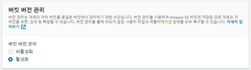 - 버킷 버전 관리를 활성화하면, 파일이 수정되었어도 그 과거 내용이 보존되도록 할 수 있다.