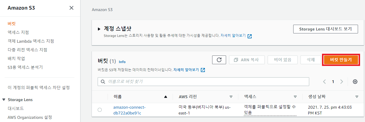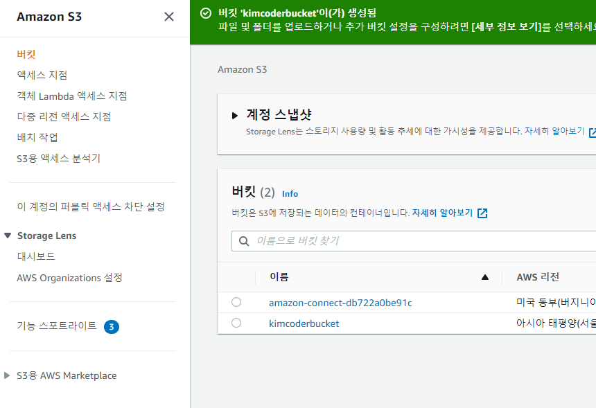 [버킷 만들기]를 누르면 아래와 같이 버킷이 생성된다.