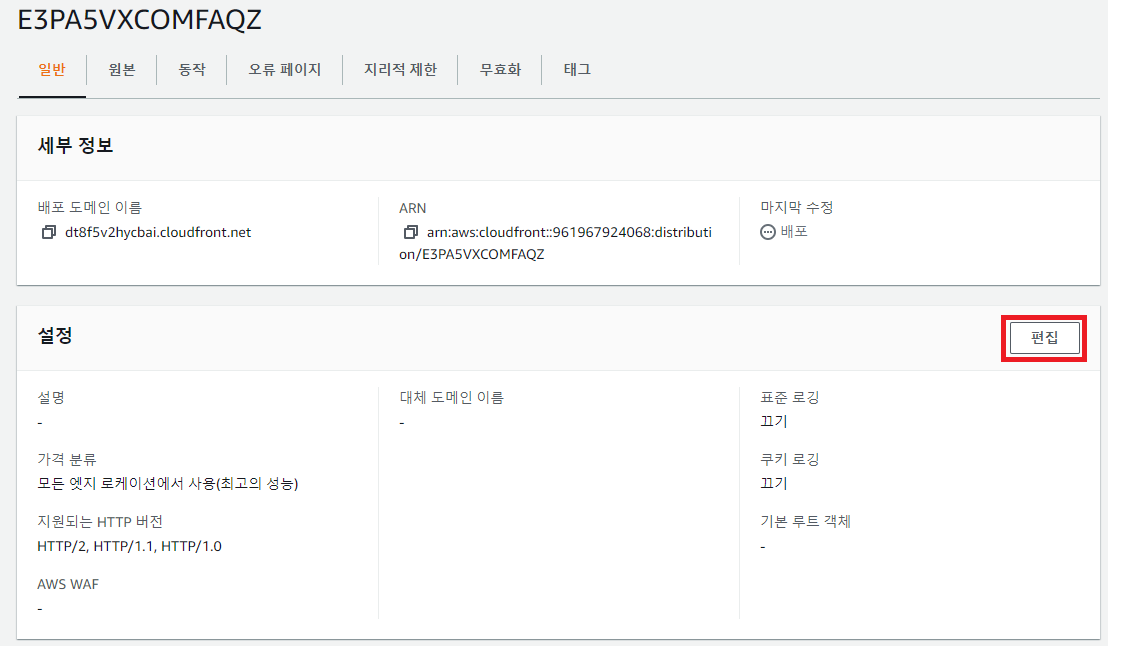 - 배포의 일반 메뉴에서 설정의 [편집]을 누른다.
