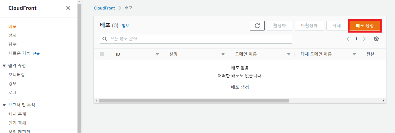 - CloudFront 콘솔의 [배포]로 들어가서 [배포 생성]을 누른다.