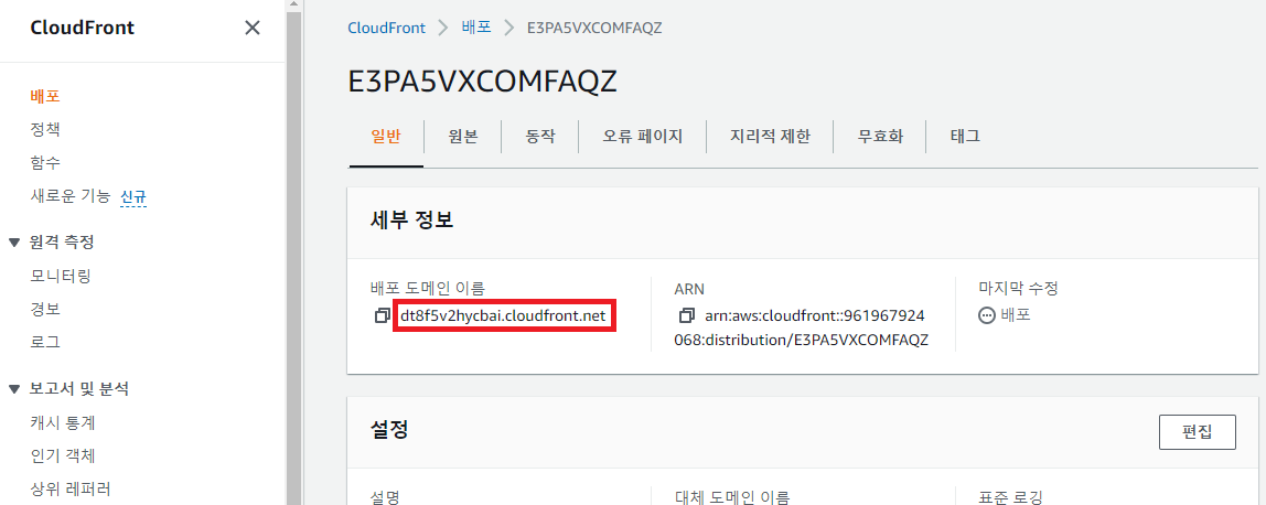 - Distribution의 [일반] 메뉴에 있는 배포 도메인 이름은 클라이언트와 웹 서버의 매개체 역할을 하는 CloudFront의 도메인 주소이다. 여러분들은 클라이언트에게 이 주소로 요청을 보내도록 지시하면 된다.