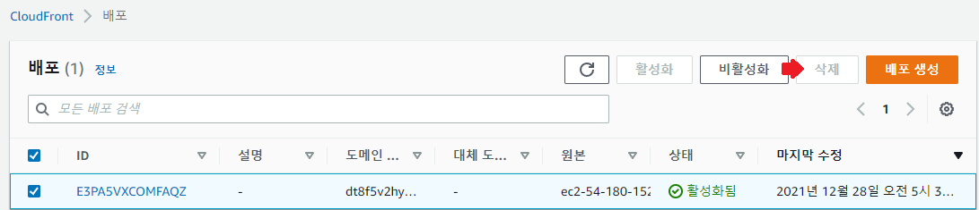 - 배포를 비활성화해야 [삭제]가 활성화된다.