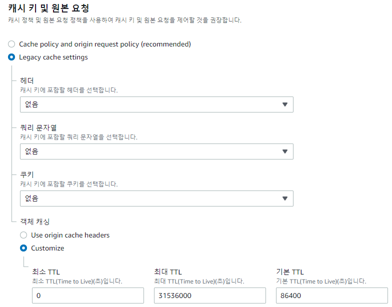 - 조금 내려보면 "캐시 키 및 원본 요청" 이라는 설정이 있는데, Legacy cache settings의 하위 설정에 있는 객체 캐싱을 Customize로 체크하여 CloudFront Cache를 커스터마이징할 수 있다.