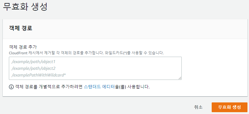 - CloudFront의 기본 Cache를 무효화 하는 것이지, 웹 서버(origin)의 Cache를 무효화 하는 것이 아님에 유의하자.