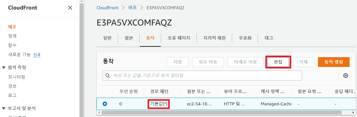 - 경로 패턴에 '*'로 표시되어 있는 것은 모든 요청에 적용되는 동작이라는 뜻이다. 이 동작을 선택하고 [편집]을 누른다.