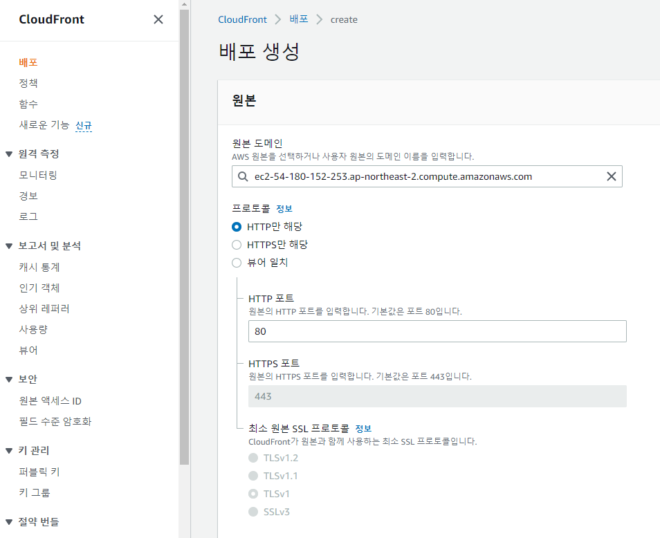 - 원본 도메인의 종류에 따라 설정 화면이 달라지므로 자세한 설명은 생략한다. 프로토콜, 포트, SSL 등에 관한 설정이 있다면 여러분의 프로젝트 성격에 맞게 진행하면 된다.