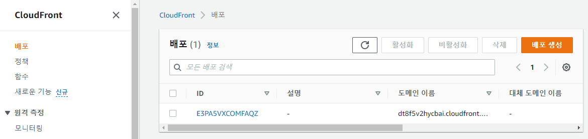 - 다시 한번 [배포 생성]을 누르면 CloudFront 배포가 생성된다.