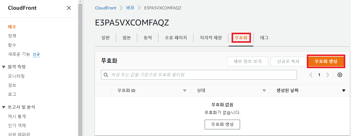 - 먼저, CloudFront의 기본 Cache를 무효화 해야 한다. [무효화] 메뉴에서 무효화를 생성하자.